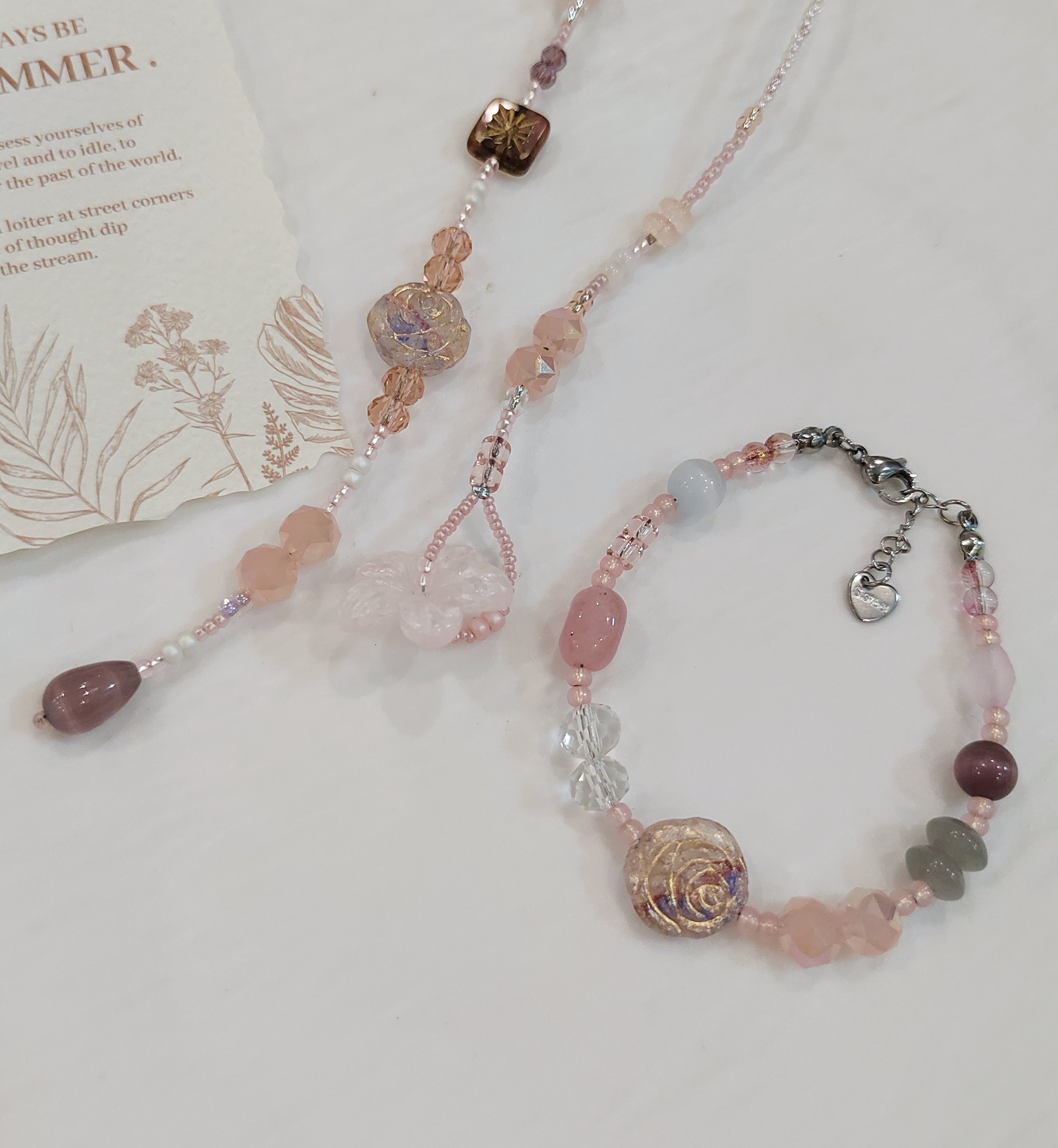 Artisan Glass Rose Focal: A handcrafted glass rose bead anchors the design, offering a refined artistic detail that sets this bracelet apart from mass-produced jewelry.