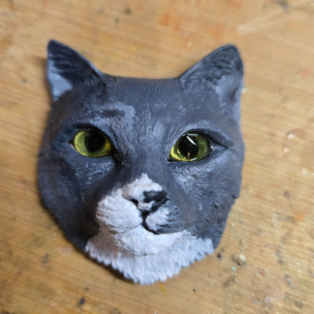 Based on photos I can create a custom hand painted replica of your cat. If you have saved whiskers I can also add the whiskers to the cats face. It can be a magnet, added as a memorial to your pets remains or placed in a small frame.