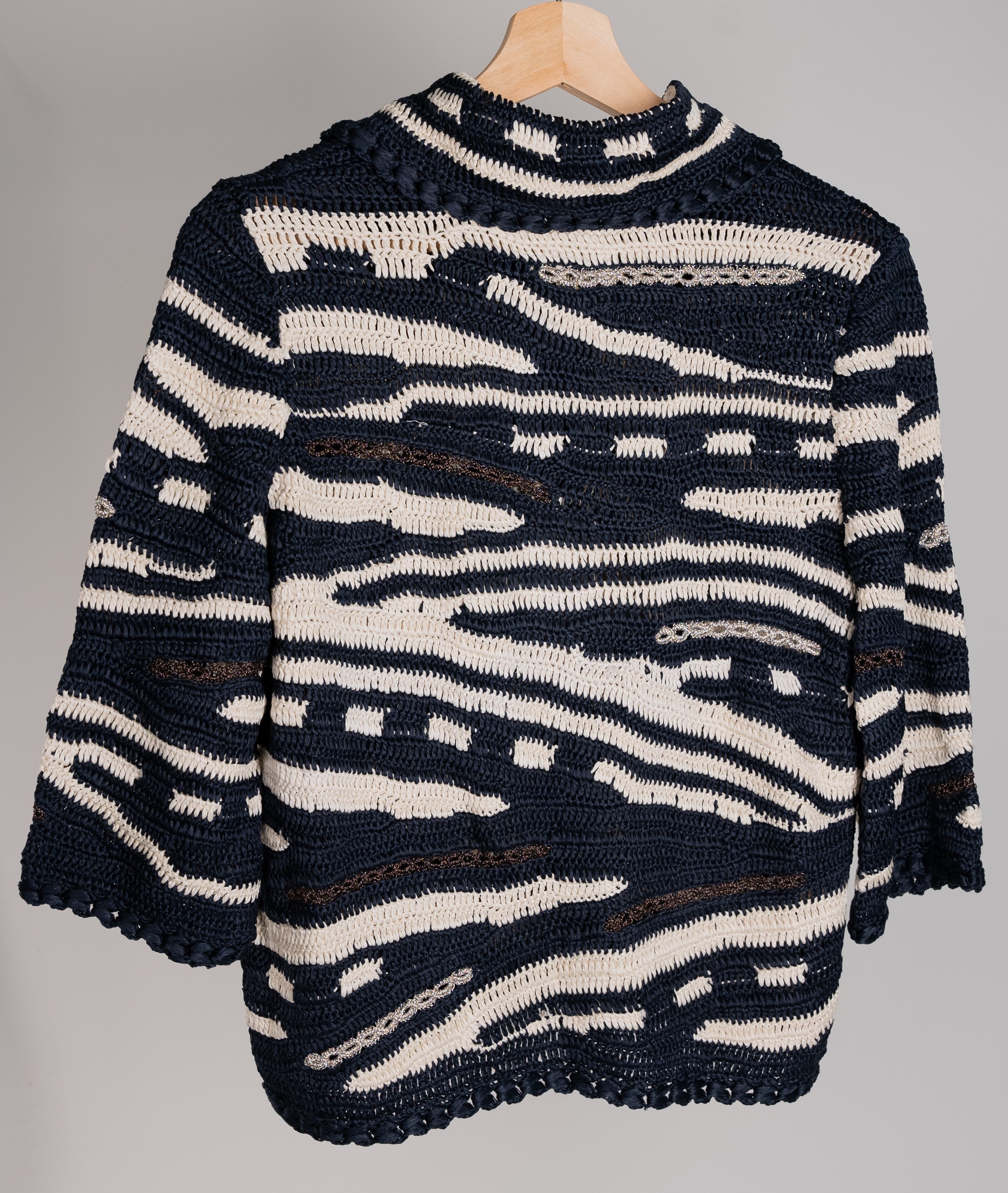 Cropped cardigan with collar and 3 snaps front placket. Yarn: 100% Japanese Silk. Dry clean only. Size: M