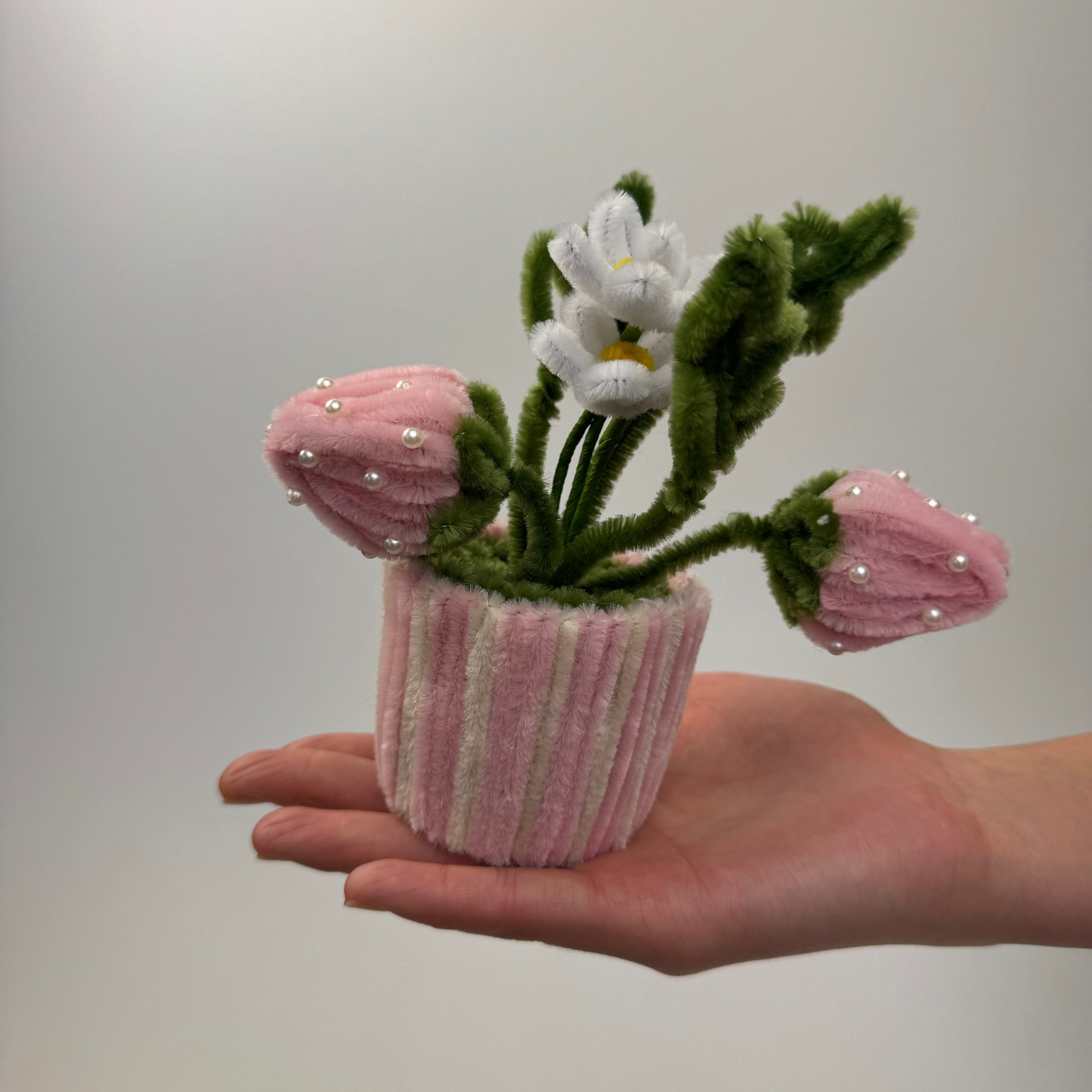 Bring the beauty of a blossoming garden into your home with the “Mini Strawberry Daisy Planter,” a charming miniature creation made entirely from pipe cleaners. This delightful potted plant features soft pink strawberries, vibrant green leaves, and delicate white daisies, all meticulously handcrafted to form a beautiful and whimsical decoration. Housed in a small, pastel-colored pot, this piece is perfect for adding a touch of nature and sweetness to your desk, shelf, or any small space in need of a little cheer.
