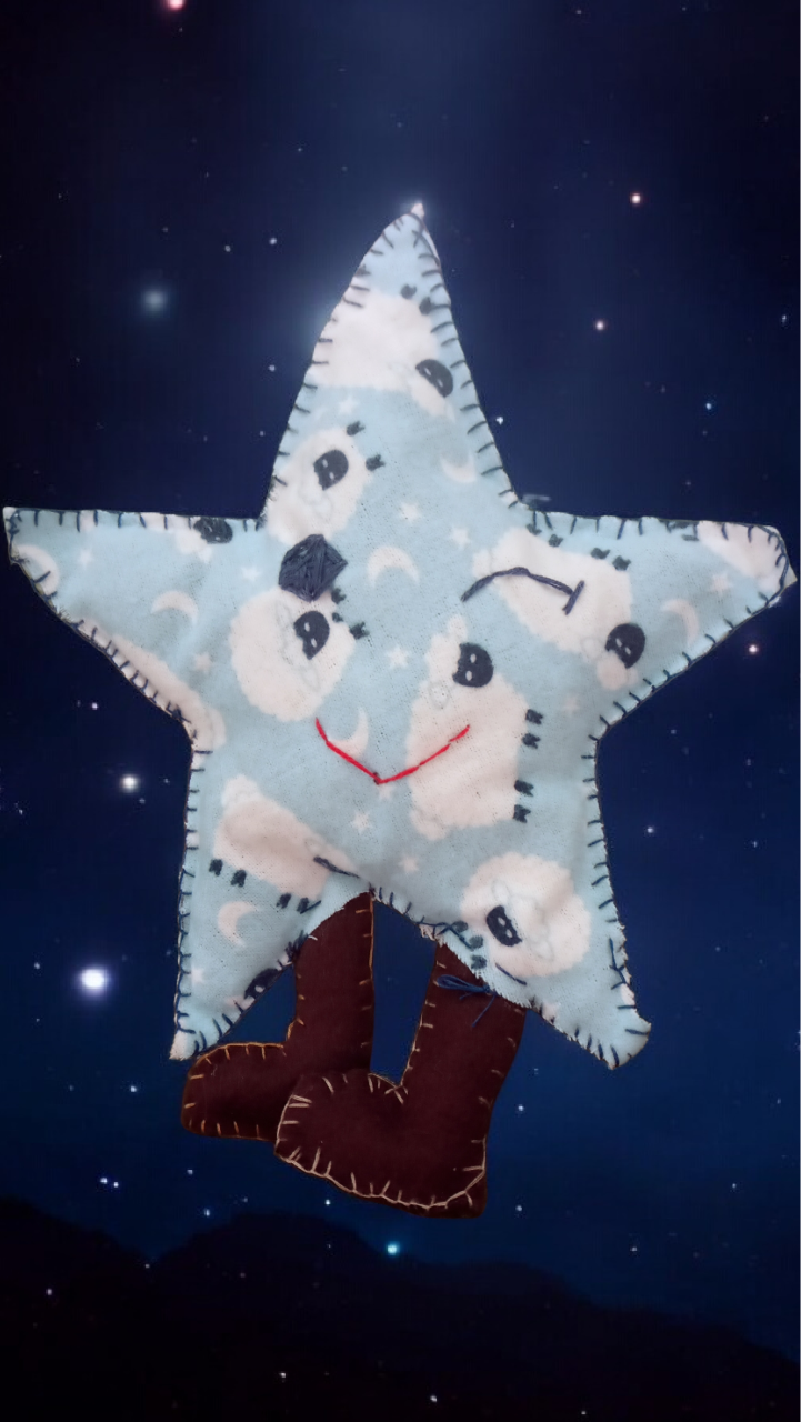 sleepy star literally wears her favorite hobby on her sleeve, and her face, and her points. is she waking up or just refusing to fully commit to morning? stuffed with plastic bags. trademark peace sign and T on back of feet.