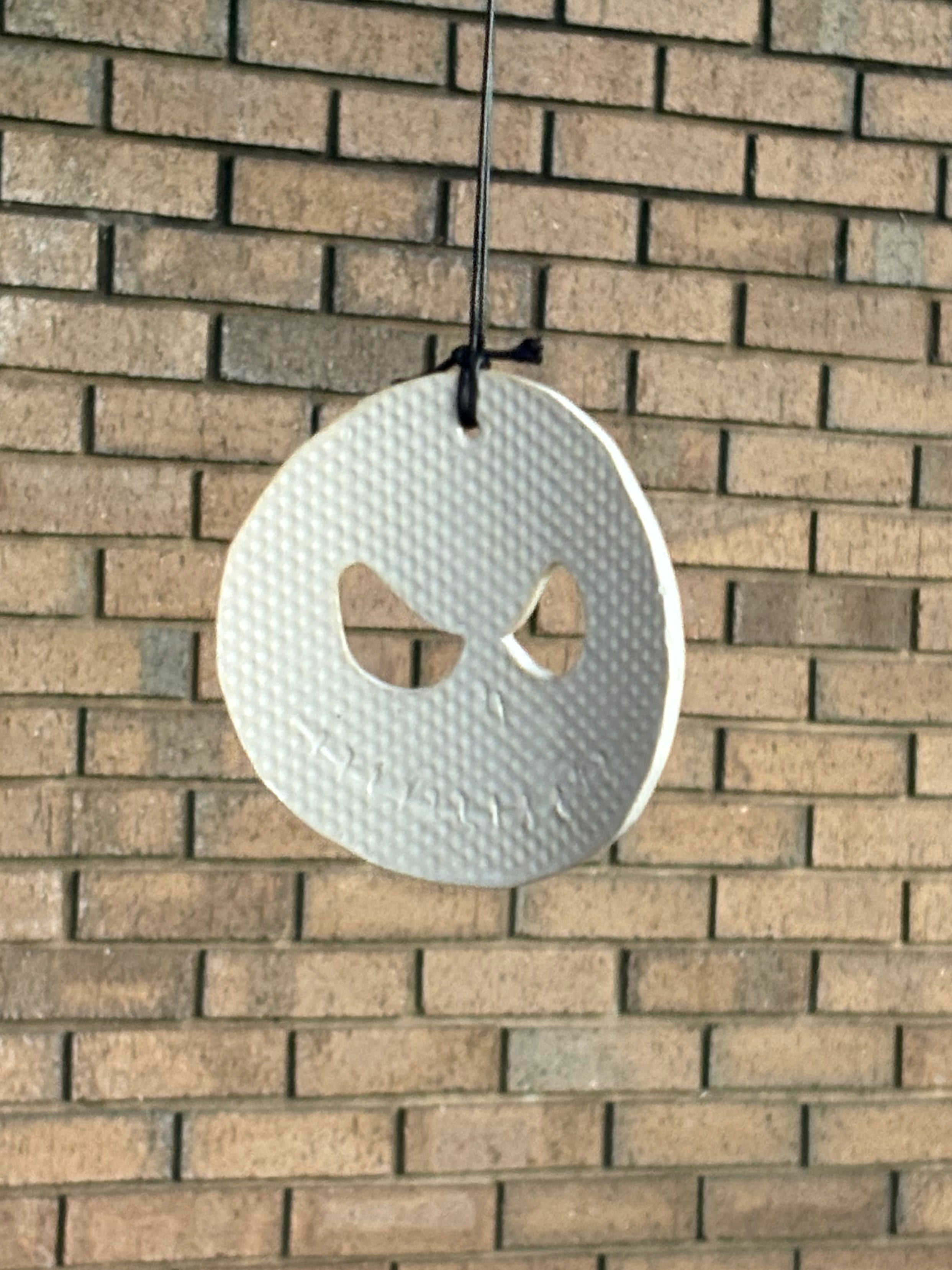 Add a playful, spooky touch to your porch, patio, or garden with this handmade hanging mobile. Featuring a trio of textured leaf-shaped drops in soft seasonal colors, plus a bold ghost-face charm at the bottom, it moves beautifully with the breeze and instantly adds personality to any outdoor space.
