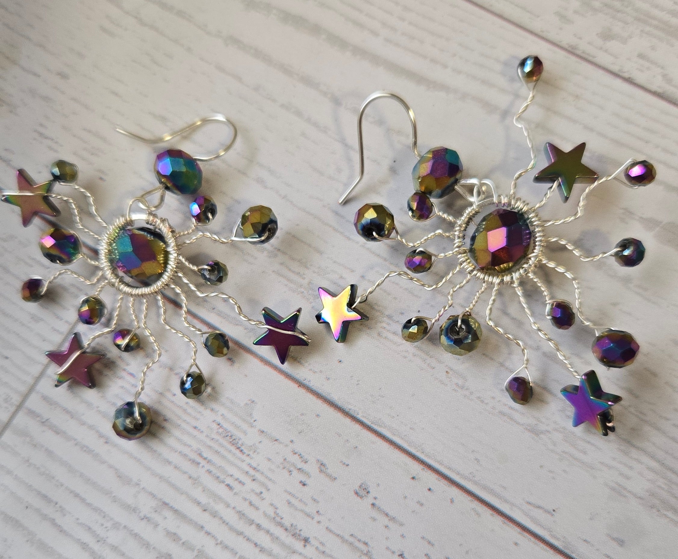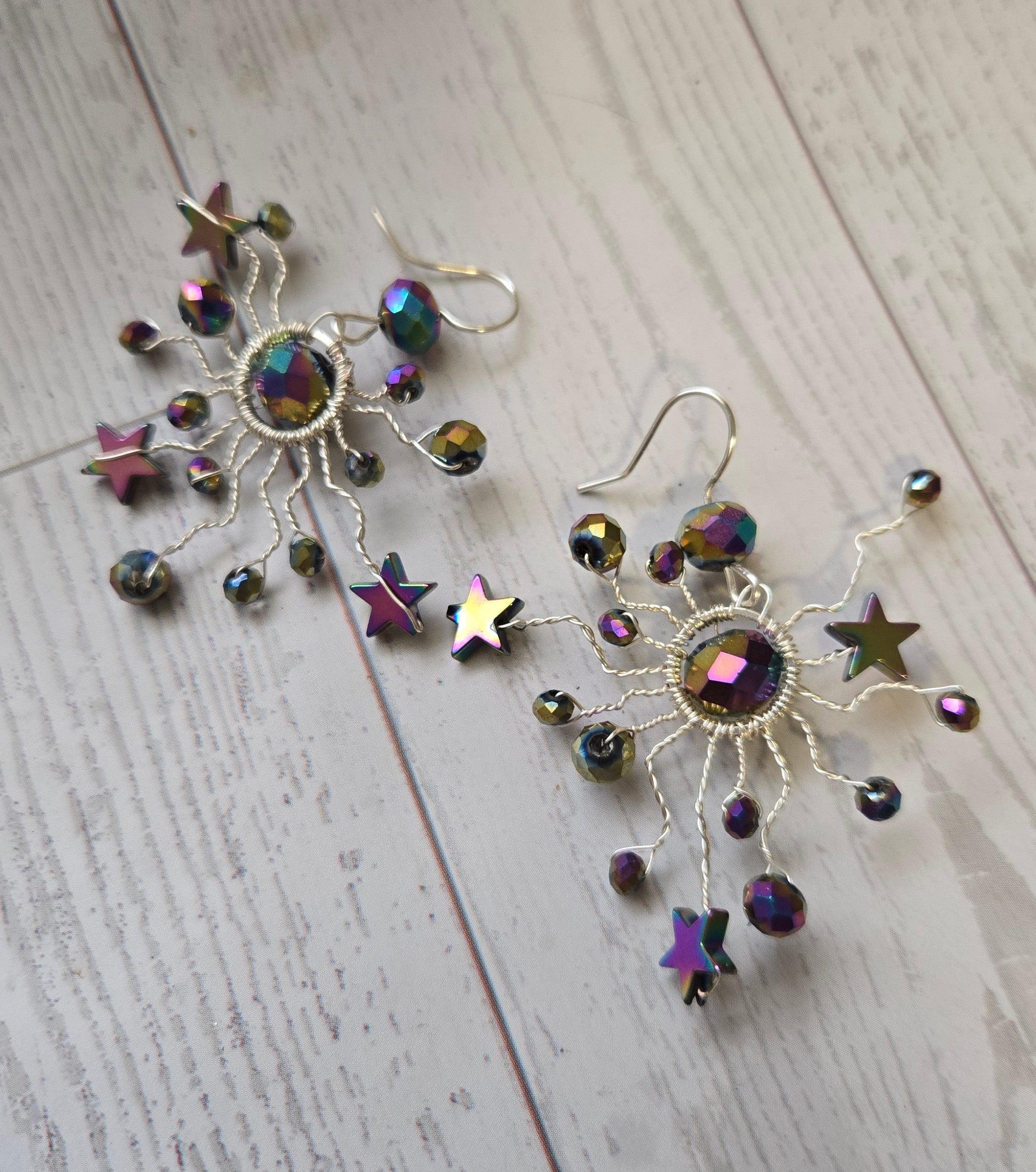 Gorgeous starburst earrings made from electroplated beads and silver tone wire. Something unique and one of a kind that will have you the talk of your friend group.