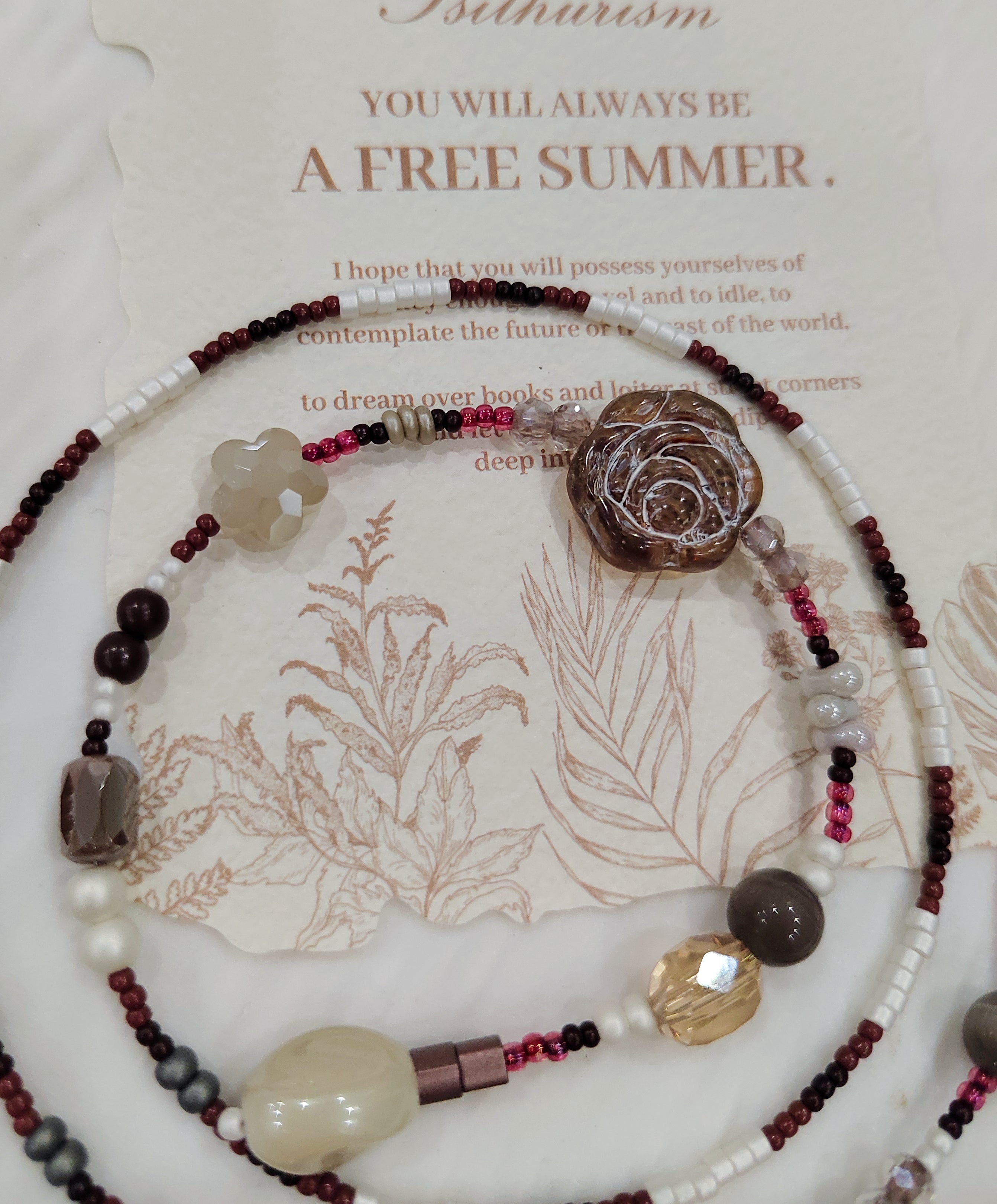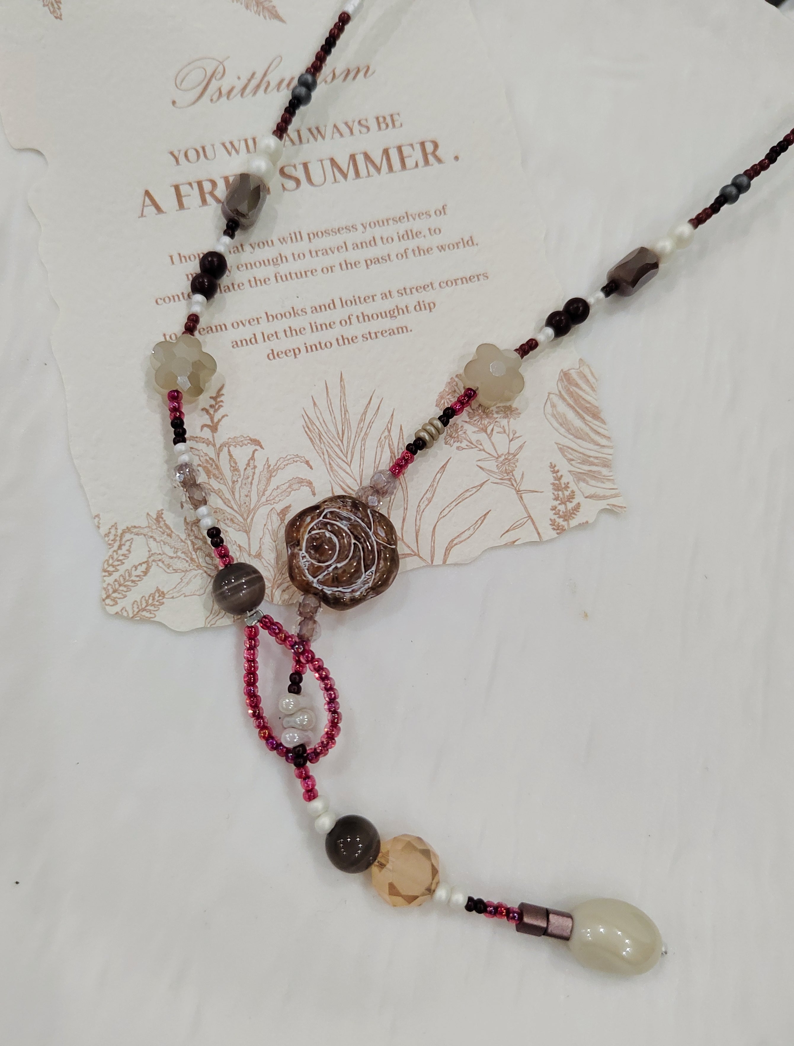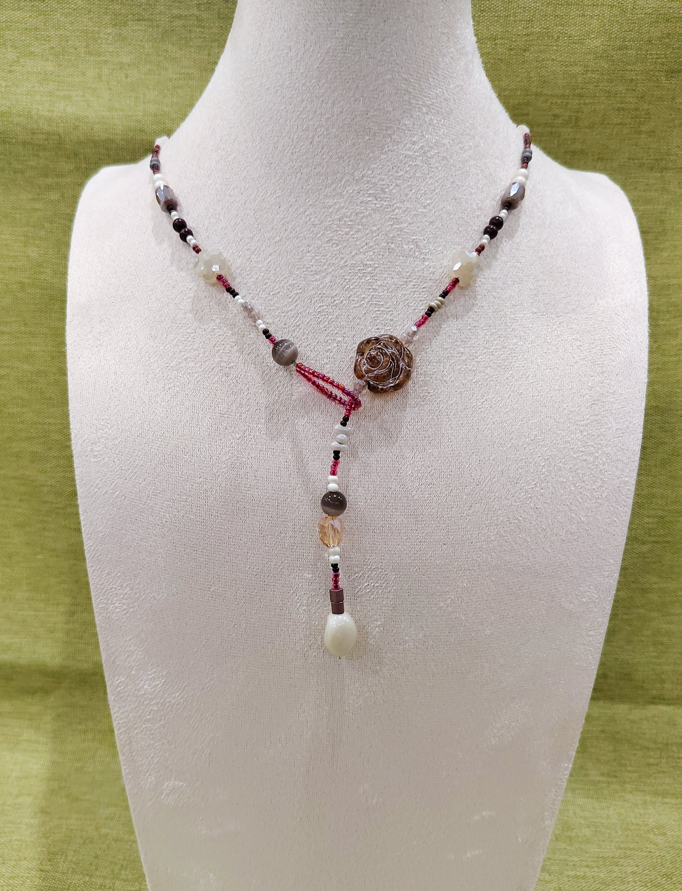 Rose Waltz Handmade Y Necklace – Adjustable Length, Multicolor Beads Natural Stones Shell Accents$18.00