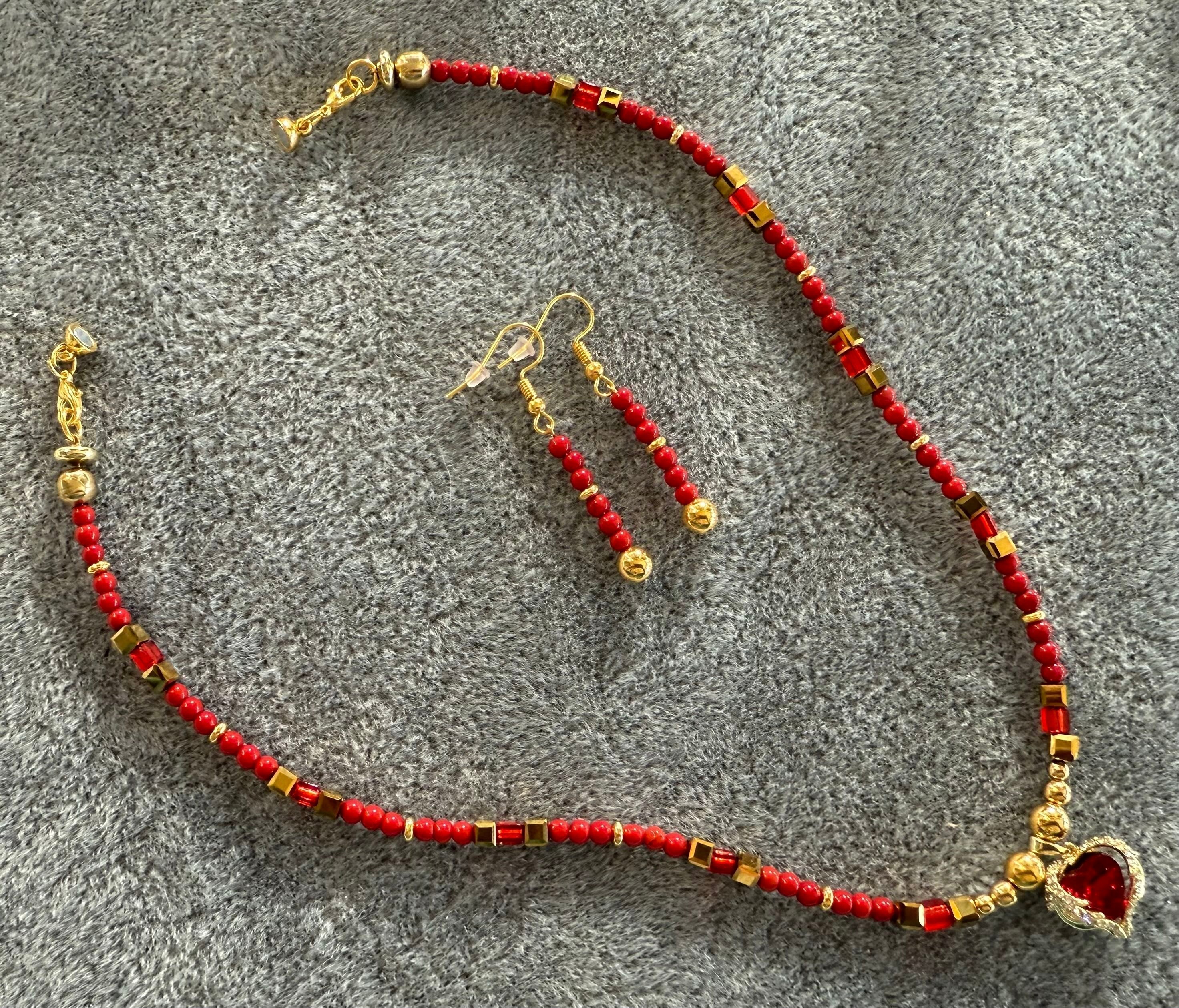 18 1/2" Lab-Created Ruby And Silver Pendant With Calcite, Crackle Quartz And Silver Accent Beads. Also, Silver And Rose Quartz Beads And Silver Spacer Beads With Matching Silver French Earwire Earrings.
