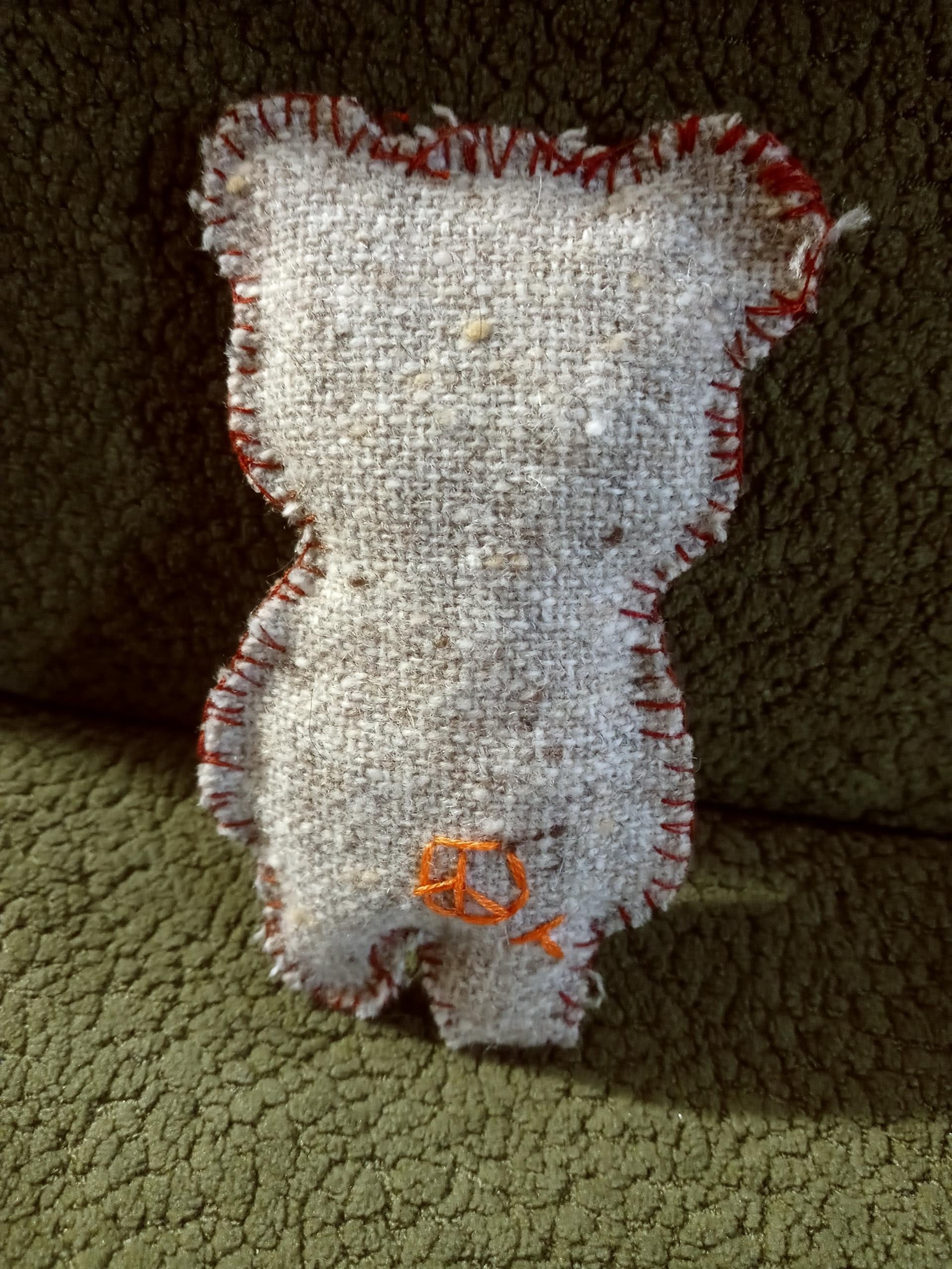 small pocket-size stuffie teddy bear with amber heart jewel and signature peace sign and T on the back. great comfort item for children. stuffed with discarded clothing.