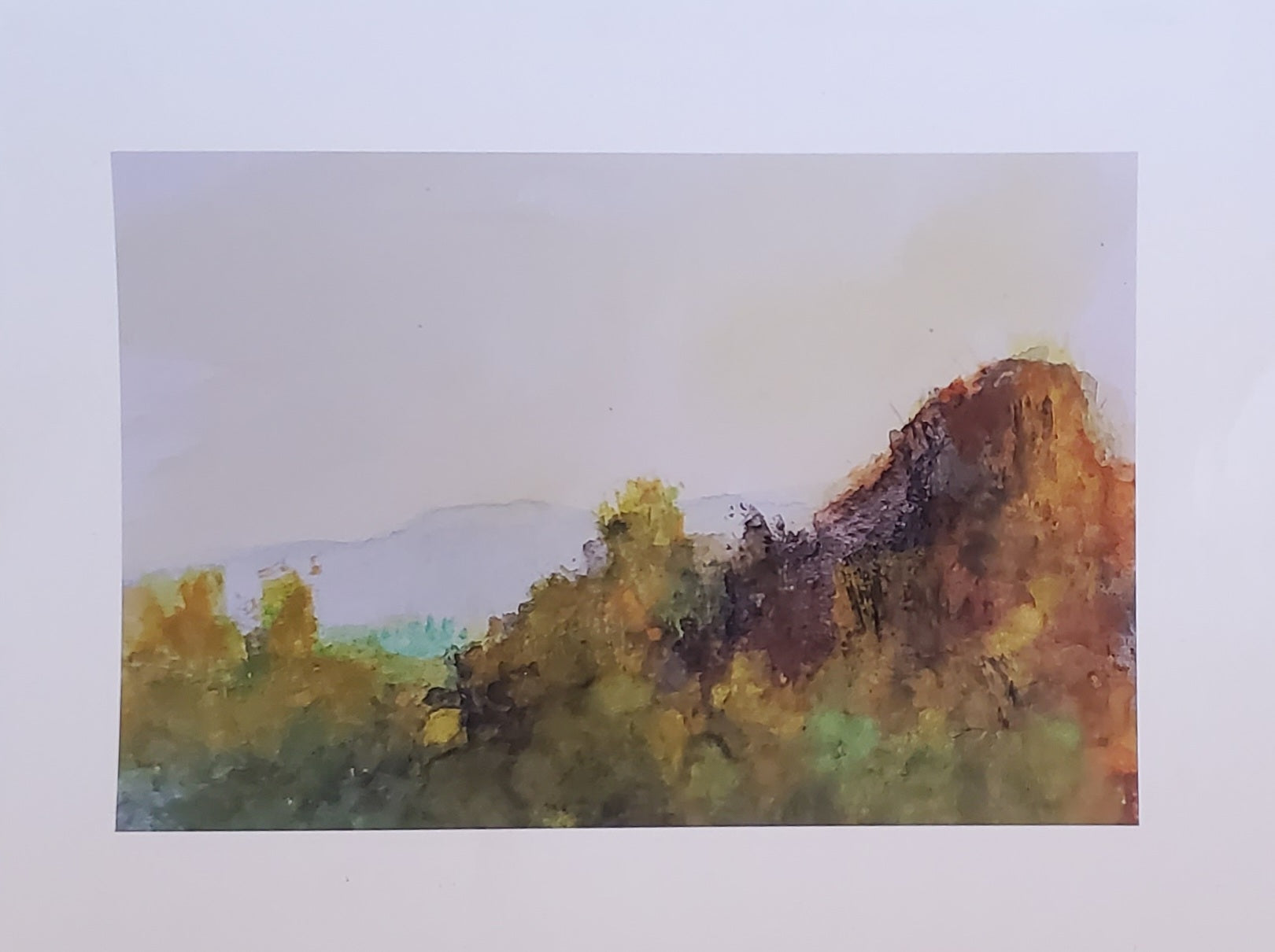My latest piece, Autumn Light, is an 8 by 10 inch giclée print that captures a quiet landscape through gentle, impressionistic brushstrokes. The foreground shifts between green and yellow tones, suggesting foliage catching the soft light of the season. On the right, warm hues of orange, brown, and muted purple define a rocky formation, while distant hills fade into pale blues and subtle purples beneath a nearly white sky. This work focuses on the calm progression of light and color in nature, inviting a moment of stillness and reflection.