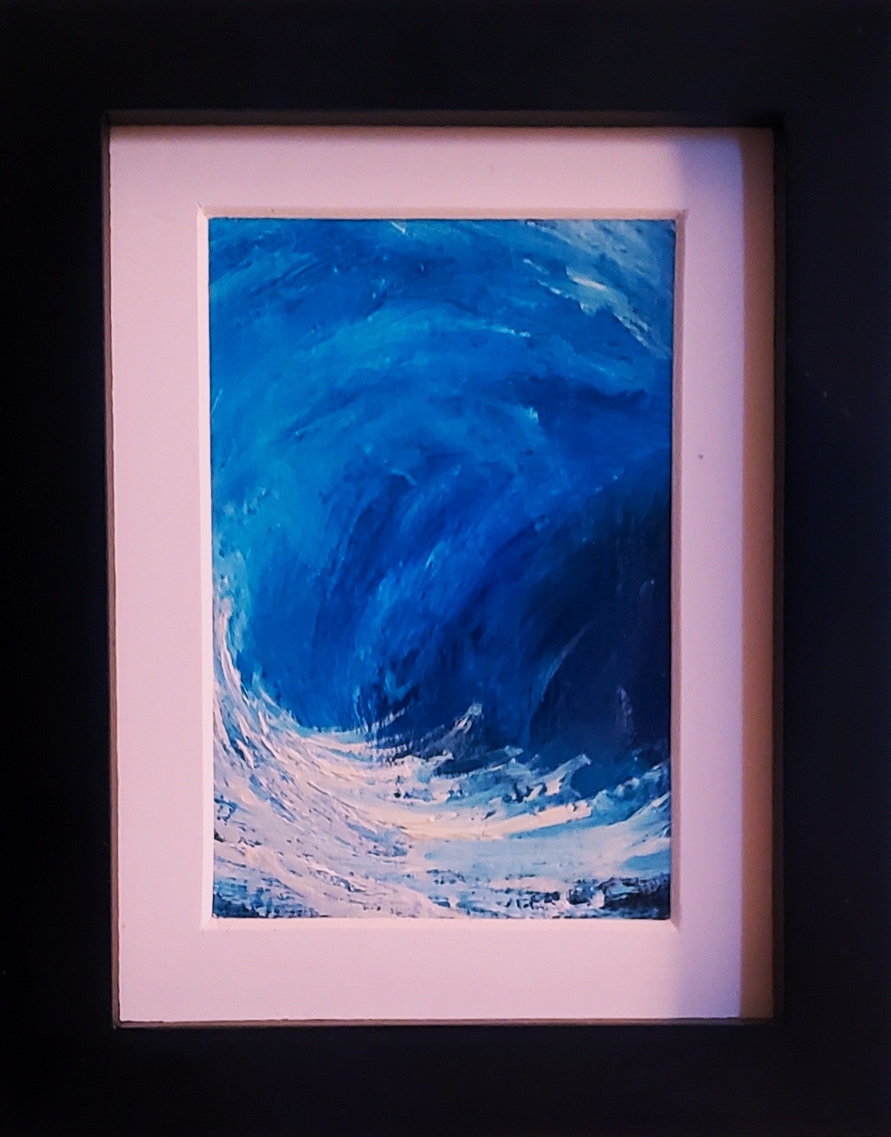 Azure Curl is a small oil painting, just 2 by 3 inches matted to 3 by 4 inches, where I focused on capturing the raw energy of a winter storm surf. The wave folds inward, forming a tunnel framed by deep navy and lighter blues that trace the shifting movement of the ocean. White highlights mark the crests and foam, adding texture and contrast to the vibrant blues. This piece invites a close look at the power and flow of water in motion, a moment of natural force shaped through bold brushwork and color. I will include a mini black easel with this framed painting