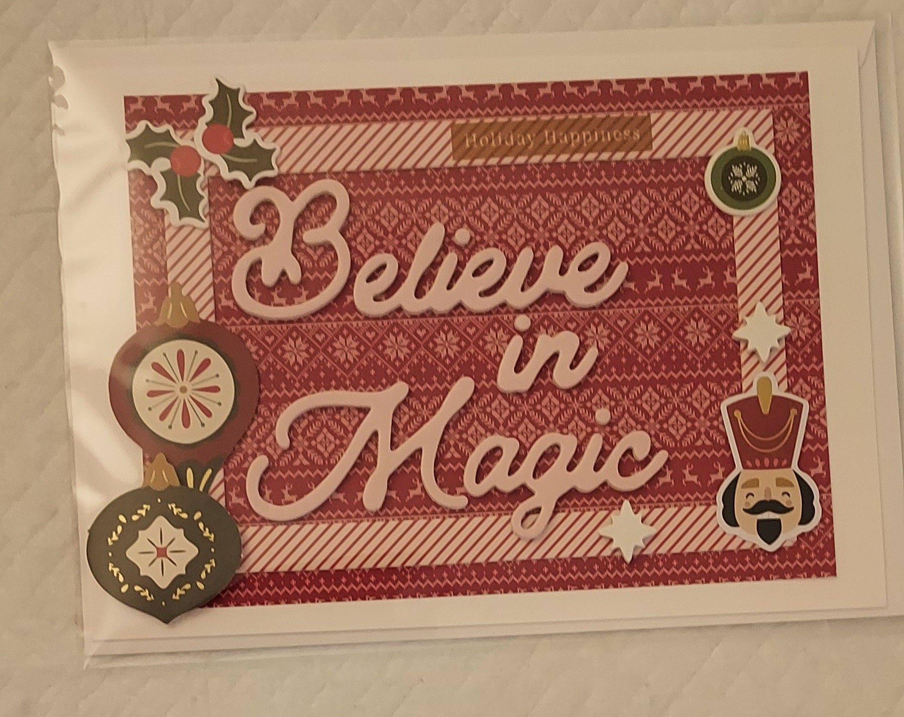 Make someone's Christmas wonderful with a beautiful handmade greeting card. The Inside sentiment reads Merry Christmas. Card comes to you wrapped in plastic. Includes white envelope.