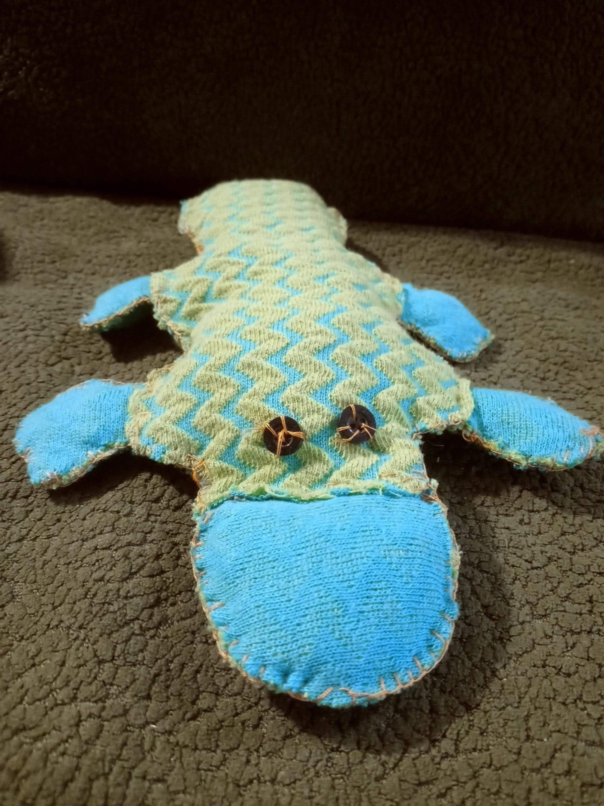 cute little blue and neon green platypus stuffie with button eyes, stuffed with plastic bags, handstitched.
